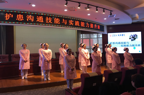 首先由徐院長做開班致辭,講到“不學(xué)禮無以立,人無禮則不生,事無禮則不成,國無禮則不寧?!睂W(xué)習(xí)溝通技能,一是有助于提高醫(yī)護(hù)人員自身修養(yǎng),二是有助于改善醫(yī)患間人際關(guān)系,也是我們維護(hù)健康醫(yī)患關(guān)系的臂膀。開班儀式中,由我院護(hù)士服務(wù)規(guī)范專業(yè)組人員展示護(hù)士標(biāo)準(zhǔn)化禮儀,從站姿、蹲姿、坐姿、點頭禮、鞠躬禮、開關(guān)門禮儀、近距離提示、原地指路、伴隨引路等方面用肢體語言,詮釋我院護(hù)理服務(wù)文化內(nèi)涵,展現(xiàn)我院護(hù)理人員的修養(yǎng)與氣質(zhì)。
