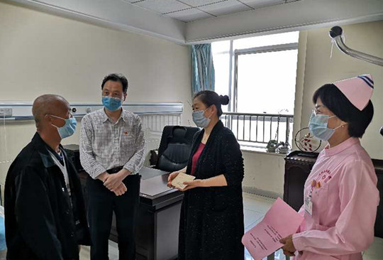 5月13日上午11:00,延安大學(xué)咸陽醫(yī)院張海濤院長、護理部楊敏主任、各系統(tǒng)總護士長前往心血管內(nèi)科VIP病區(qū)、腫瘤胸外科、神經(jīng)內(nèi)科VIP二病區(qū)、門診透析室,在相關(guān)科室主任、護士長的陪同下將善款送到患者(家屬)的手中,楊敏主任向患者說明了我們此次善款的來源及捐獻的目的,張海濤院長向患者及家屬表達了親切的問候?;颊哌B聲感謝表達感激之情!