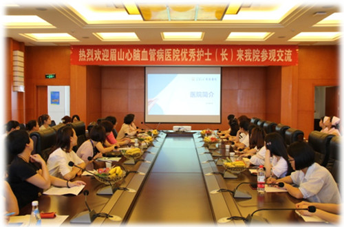 5月17日,眉山心腦血管病醫(yī)院王超英副主任帶領(lǐng)優(yōu)秀護(hù)士、優(yōu)秀護(hù)士長(zhǎng)一行15人來我院參觀交流學(xué)習(xí)。我院護(hù)理部精心準(zhǔn)備交流內(nèi)容及接待方案。