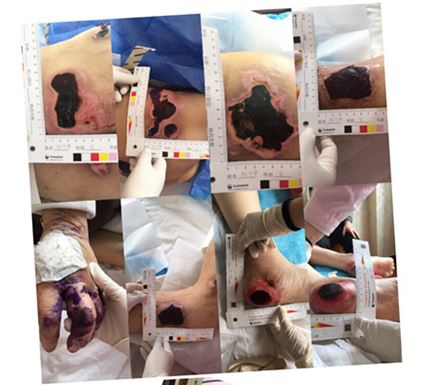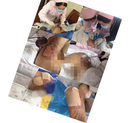 惆悵、無(wú)奈、擔(dān)憂于眼前都是多余,眼下我們要做的是如何著手護(hù)理此患者。按要求我們填寫(xiě)了相關(guān)記錄表,立即請(qǐng)壓瘡專業(yè)組劉娜護(hù)士長(zhǎng)進(jìn)行會(huì)診。配合她一起對(duì)患者的所有瘡面進(jìn)行了清洗,清除焦痂和腐肉、對(duì)無(wú)法立刻去除的焦痂創(chuàng)面開(kāi)窗引流,根據(jù)不同創(chuàng)面分別進(jìn)行處理,促進(jìn)肉芽組織生長(zhǎng),保護(hù)暴露的肌腱和肌肉……,這樣的彎腰俯身護(hù)理一做就是2個(gè)多小時(shí)。