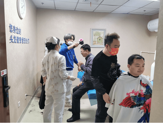各位發(fā)型師自帶理發(fā)工具,理發(fā)過程中嚴格把控衛(wèi)生防疫措施,每個發(fā)型師均佩戴口罩,并對剪發(fā)工具、理發(fā)場所用酒精等進行消毒。在我院皮膚科工作人員的大力協(xié)助下,7位發(fā)型師在兩天時間內(nèi)為我院240位職工義務剪發(fā)。