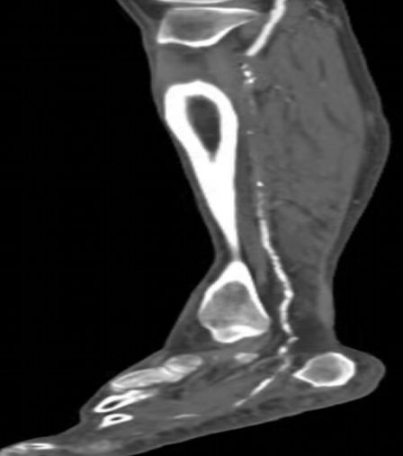 情急之下去了當(dāng)?shù)蒯t(yī)院,醫(yī)生一瞧告訴王大伯:“您這可能是糖尿病足,你這傷口肯定是長不好了,需要外科手術(shù)清創(chuàng)、植皮,如果還是長不好就要截肢”。聽了醫(yī)生的話,王大伯出了一身冷汗,幾經(jīng)周折最終來到了我院血液內(nèi)分泌科,住院后進(jìn)行下肢動脈超聲及CTA發(fā)現(xiàn):雙下肢膝下動脈節(jié)段性狹窄、閉塞。診斷為:右下肢動脈硬化閉塞癥(Runtherford6級),糖尿病下肢嚴(yán)重缺血(右側(cè)),右足潰瘍;經(jīng)多學(xué)科會診初期"改善循環(huán)、控制血糖、抗感染、局部清創(chuàng)換藥、營養(yǎng)神經(jīng)、支持治療"六環(huán)法措施下,老伯潰瘍雖有好轉(zhuǎn),但仍不能完全愈合,右足仍靜息下疼痛。