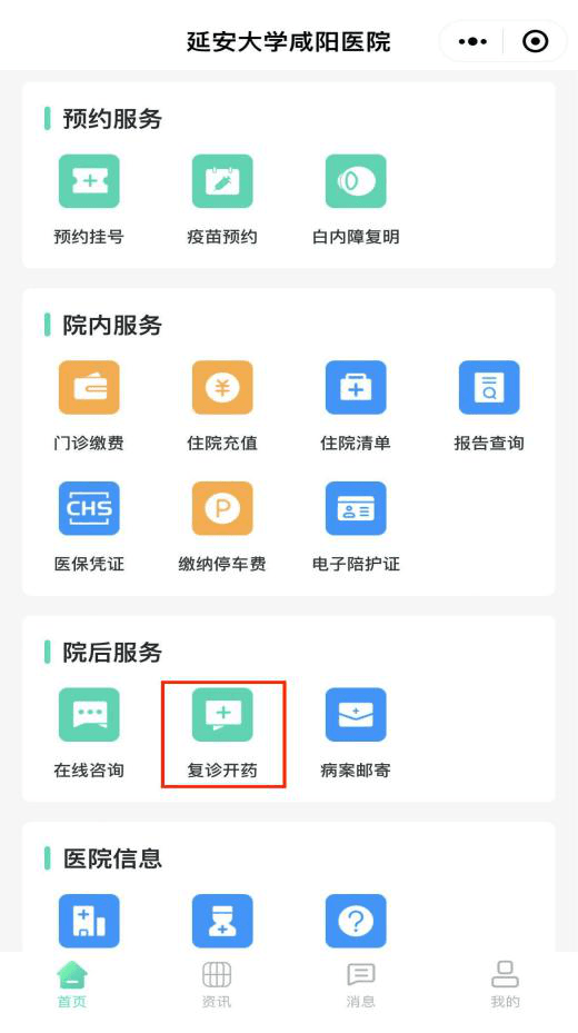 注冊(cè)綁定電子就診卡后,點(diǎn)擊復(fù)診開(kāi)藥
