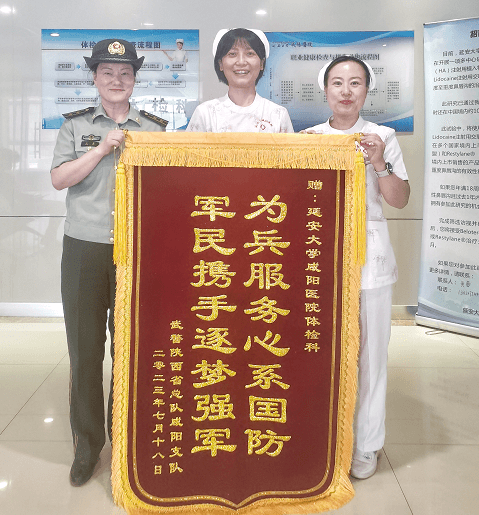 軍愛民,民擁軍,軍民關(guān)系魚水情。7月21日早晨,武警咸陽支隊中隊長把一面寫有“為兵服務(wù)心系國防,軍民攜手逐夢強軍”的錦旗送到了延安大學(xué)咸陽醫(yī)院體檢科主任手中,感謝延安大學(xué)咸陽醫(yī)院體檢科高質(zhì)量的體檢服務(wù)和認(rèn)真負(fù)責(zé)的檢查態(tài)度。這是體檢科再一次以優(yōu)質(zhì)的服務(wù)贏得客戶贊許,收到體檢客戶送來的感謝錦旗。